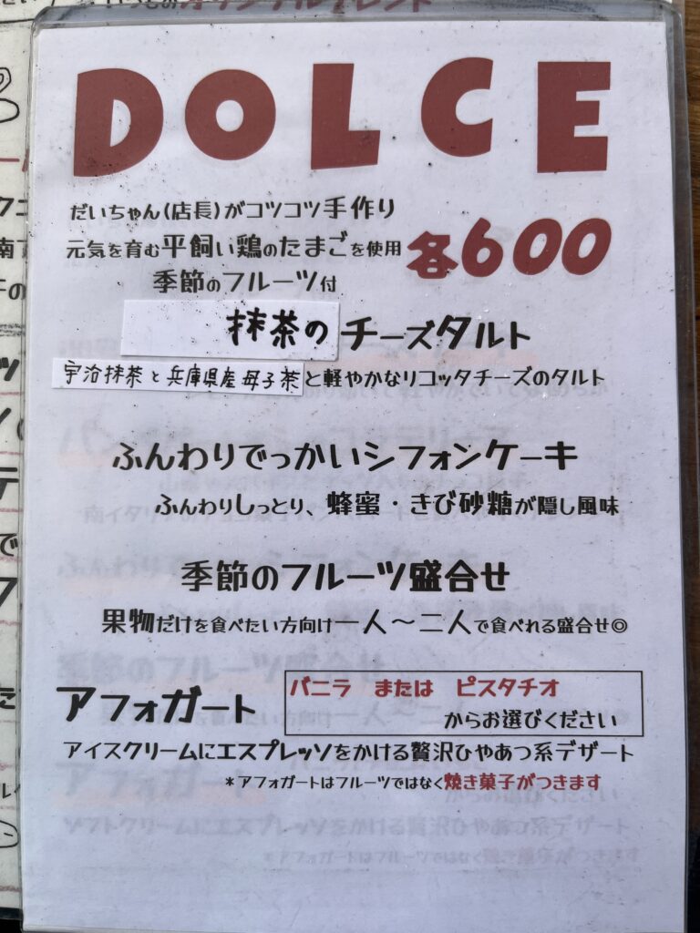 メインのピザを選択し、料金のグレードによって前菜盛り、ドリンク、ミニドルチェがプラスされていくようなセットメニューも選べるシステムでした。