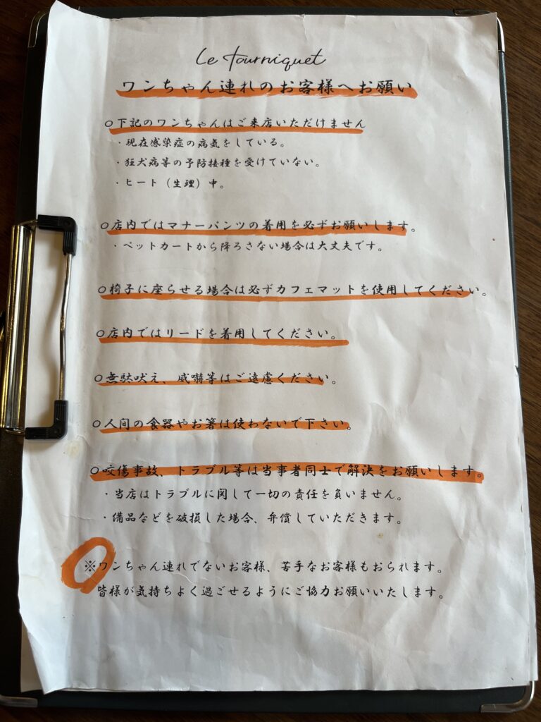 店内に犬を連れて入ることができ、マナーパンツ着用やカフェマットの持参、リードの使用などのルールを守れば、ペット同伴での利用が可能です。