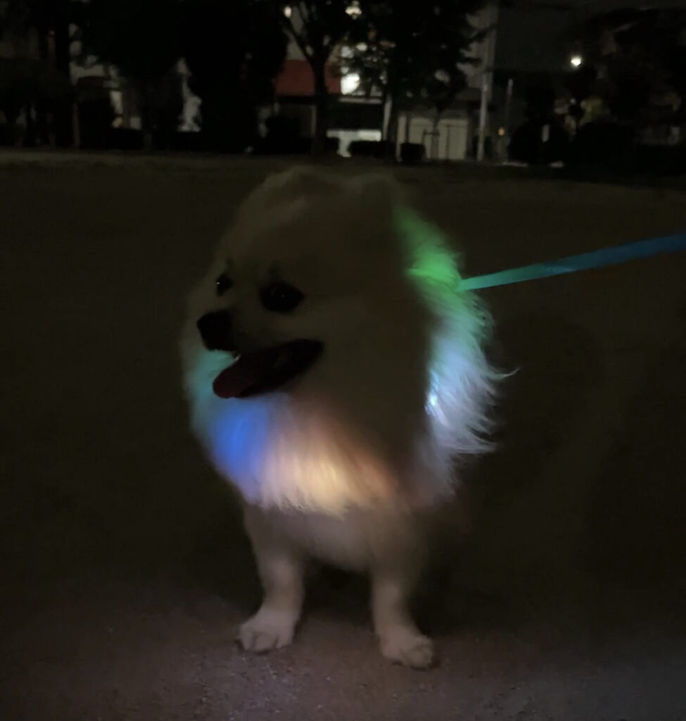 レインボーに光る首輪と、ネオンカラーに反射素材のついた新作のフレキシのリードで、