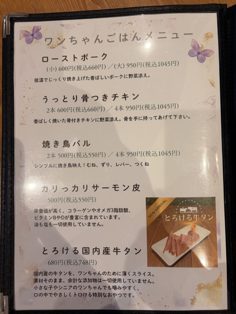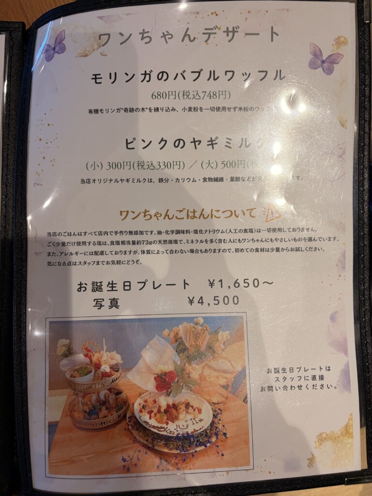 ほかのカフェとは一線を画すのが、犬専用メニューの豊富さです。他店では珍しい焼き鳥風メニューなど、一つひとつが犬用に手作りされた無添加メニューとして揃っています。さらにはわんこ用デザートも充実しているため、愛犬と一緒に人も犬も満足できる食体験が可能です。